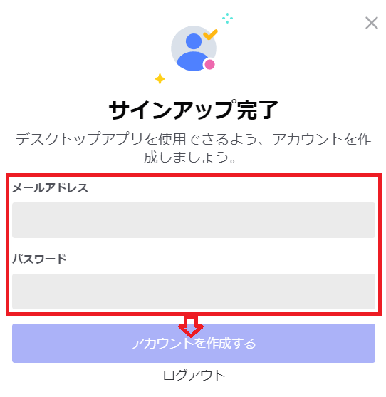 下図の画面になったら、メールアドレスとパスワードを入力して「アカウントを作成する」をクリックします。