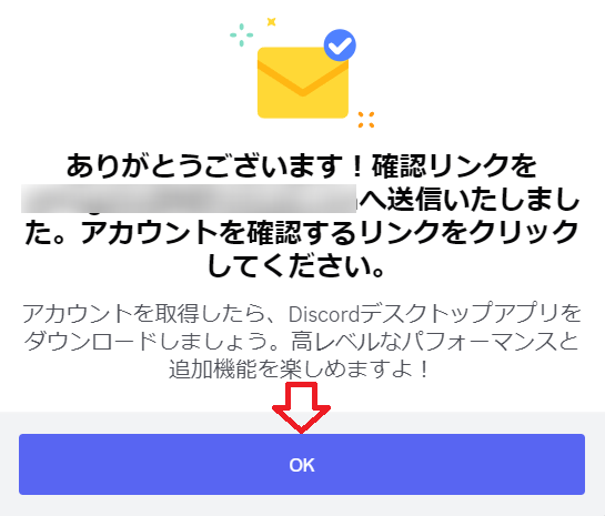 確認リンクが、メールアドレスに送られたというメッセージが出るので、「OK」をクリックします。
