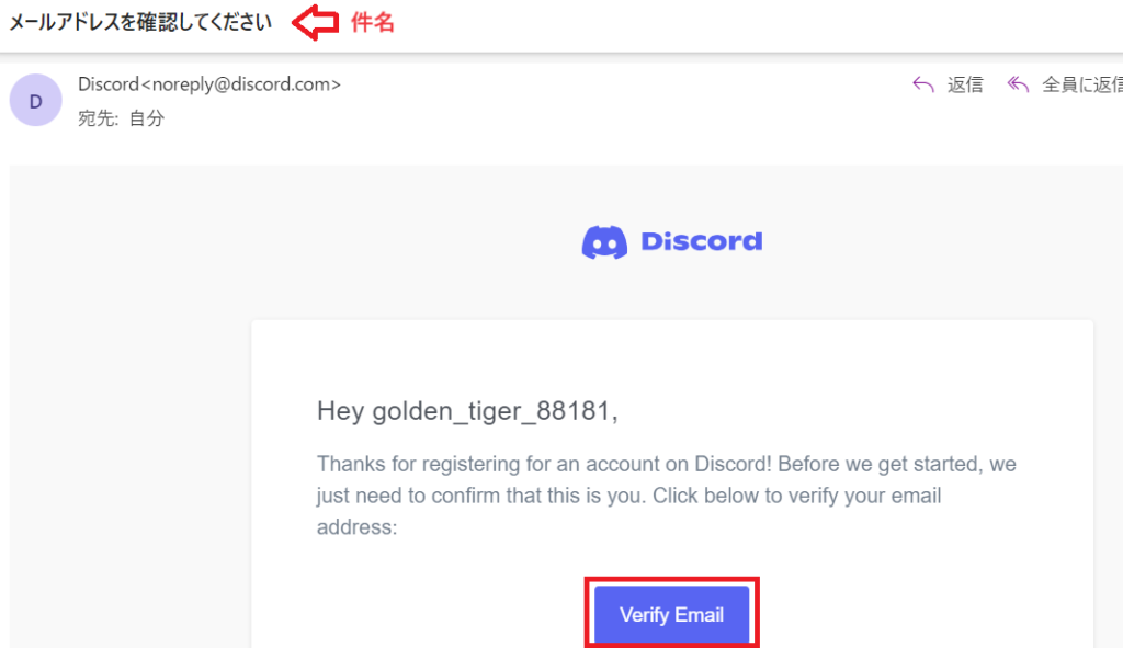 送られてきたメール(件名:メールアドレスを確認してください)を開いて、「Verify Email」をクリックします。ディスコードアプリを起動するか確認された場合は、アプリを起動してください。