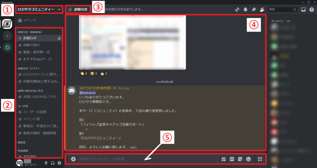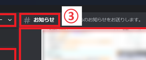 下図②のチャンネルをクリックすることで、ご自身のメッセージを書き込んだり、他の人の書込みを確認できます。