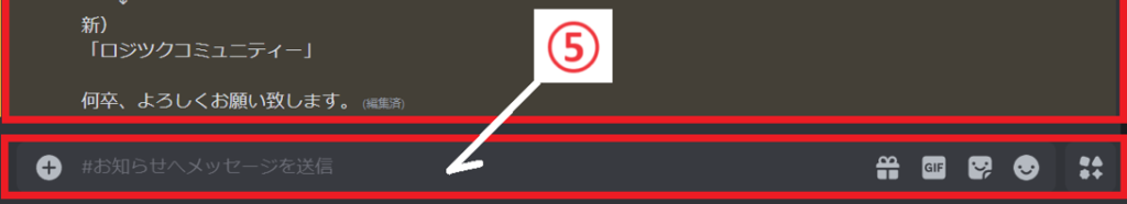 ⑤ この欄から、自分のメッセージを、チャンネルに書き込んだり、画像をアップできます